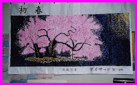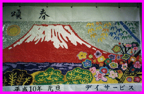 今年のちぎり絵です。 → 職員は著作権が問題にならないように、 下書きをして、利用者約90名の方が、 携わって、色紙をちぎる人、糊付けする 人、皆の合作です。(約三畳の大きさ) |