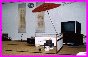 初釜の時の写真です。(=^_^=)ニャア こちらからは裏が見えておりますが、 利用者からは見えない様にセットしました。 視覚と聴覚で演出だそうです。 |