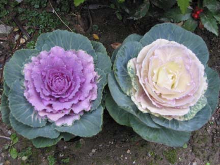 | お正月頃の鉢植えでおなじみのハボタンは、美しい色づく葉を楽しみます。 春には菜の花のような花が咲きます。水は、土が乾いたらたっぷりと与える。 |