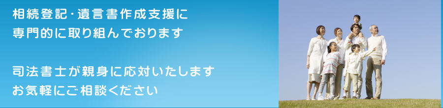 相続登記や相続放棄、遺言書作成支援など、相続手続に特化して専門的に取り組んでいる司法書士が親身になってご相談をお受けして、適切な手続きをご案内・ご提案いたします。